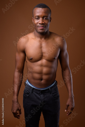 © Ranta Images, Fototapeta premium Young shirtless African man against brown background