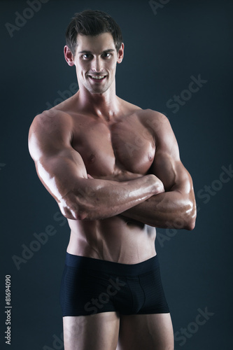 Fototapeta premium Young shirtless body builder with great smile in black shorts