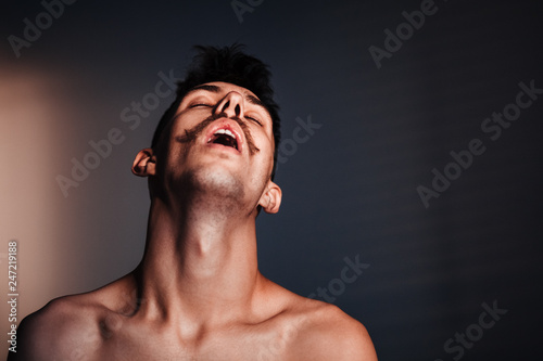 © marjan4782, Fototapeta premium Young shirtless man in despair by the window