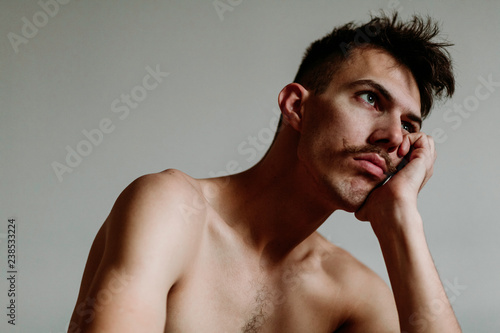 © marjan4782, Fototapeta premium Young shirtless man with mustache thinking