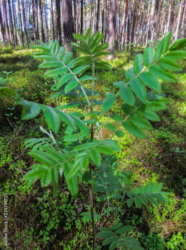 © lizaveta25, Obraz premium Young shoots and blossoming leaves of mountain ash on a tree in spring.