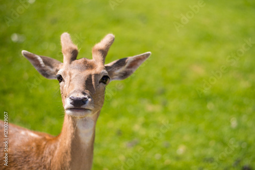 © Alevtina, Fototapeta premium young shy fallow deer playing in the green meadow