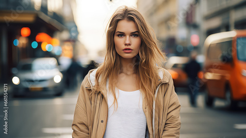 Fototapeta premium Young single woman on a city street. Autumn Depression, loneliness in the big city.