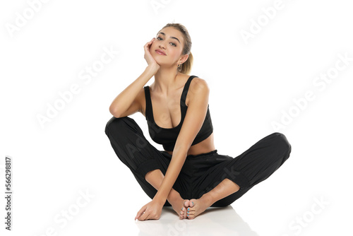Fototapeta premium young sitting happy woman in sport clothes on white background