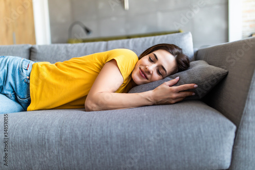 Fototapeta premium Young sleeping woman is lying on a pillow on a couch