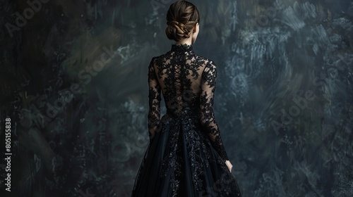 © lander, Fototapeta premium Young Slender Girl Captured from the Back in a Chic Black Lace Evening Gown