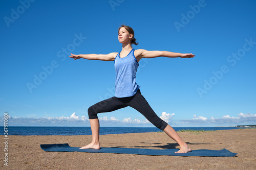 Fototapeta premium Young slim girl doing yoga on the beach on a sunny morning