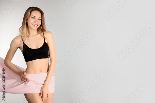 Naklejka premium Young slim woman covering her body with fabric on light background. Space for text
