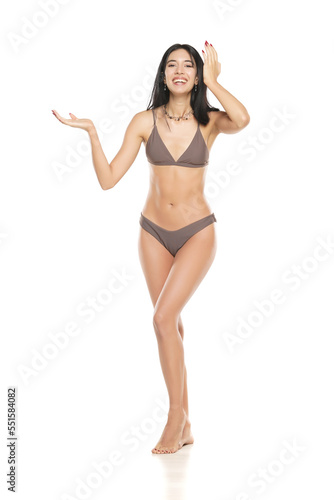 Fototapeta premium Young smiling brunette woman in bikini swimsuit advertising imaginary object on her hand on a white background.