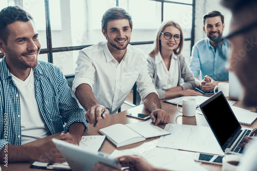 © Vadym Huzhva, Obraz premium Young Smiling Business People on Meeting in Office