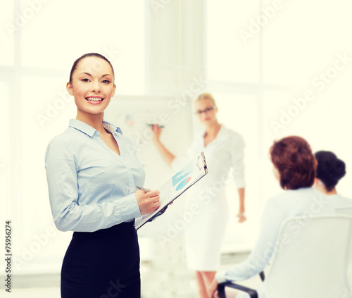 Fototapeta premium young smiling businesswoman with clipboard and pen