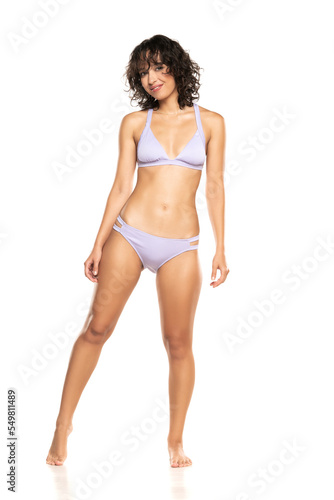 © vladimirfloyd, Fototapeta premium Young smiling exotic brunette woman in lilac bikini swimsuit posing on a white background. Front view.