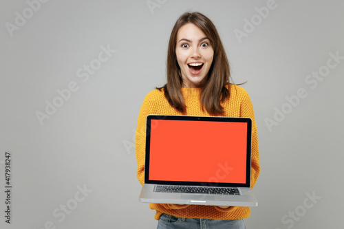 Naklejka premium Young smiling freelancer copywriter attractive caucasian woman 20s in knitted yellow sweater hold laptop pc computer with blank screen workspace area isolated on grey color background studio portrait