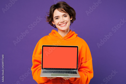 © ViDi Studio, Naklejka premium Young smiling happy Caucasian IT woman she wear orange hoody casual clothes hold use work on laptop pc computer with blank screen workspace area isolated on plain purple background. Lifestyle concept.