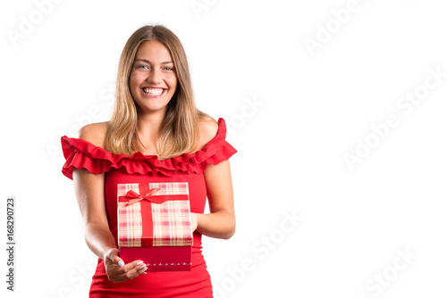 © fotoinfot, Fototapeta premium Young smiling model hold gift box.