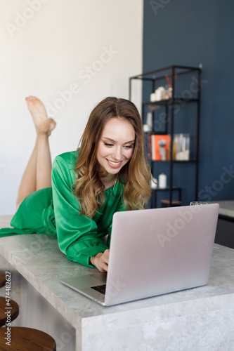 © GTeam, Fototapeta premium young smiling woman in dress at home with laptop and champagne, freelance worker