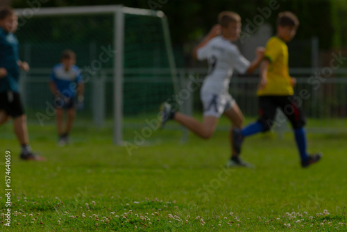 Obraz premium Young soccer players energetically running across a vibrant grass field...