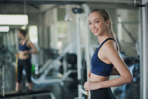 Obraz premium Young sport Caucasian woman shot hair is measuring waist in gym near big...