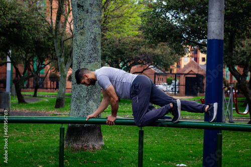 © Edwin, Fototapeta premium young sportsman in sportswear doing front squat on one leg forward with hands folded outside in city park during routine workout in morning