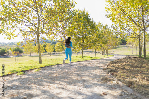 Fototapeta premium Young sportswoman running in a park during a sunny day