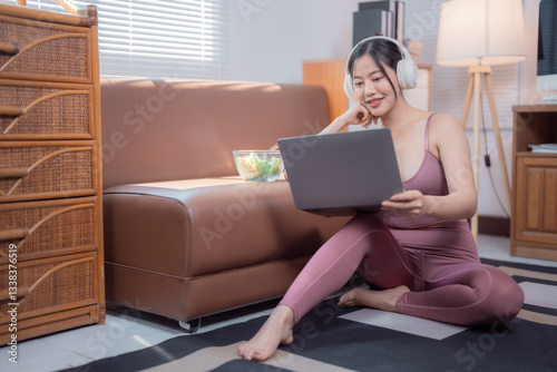 © Tj, Fototapeta premium Young sportswoman wearing headphones using laptop and eating salad at home, sitting on the floor with a bowl of salad on the sofa next to her, she's enjoying healthy lifestyle