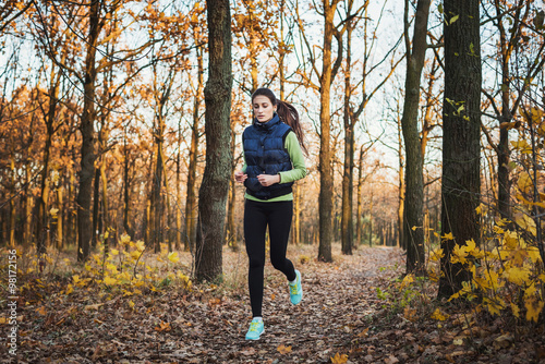 © kurapatka, Fototapeta premium young sporty caucasian female running in autumn park
