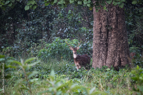 Fototapeta premium young spotted deer in Bardiya National Park in Nepal, looking at the camera