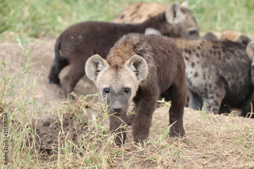 © Marie, Fototapeta premium Young spotted hyena cub standing by its den.