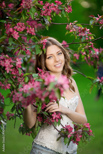 © Miramiska, Fototapeta premium Young spring fashion woman in spring garden Springtime Summertim