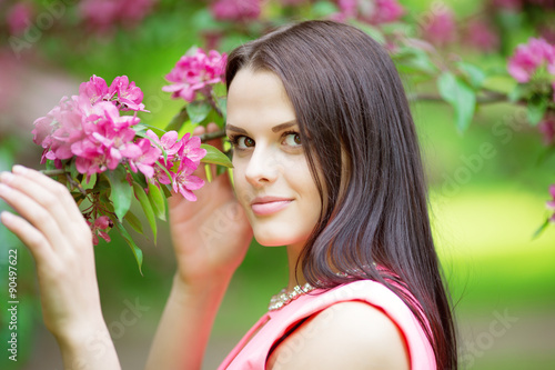 © Miramiska, Fototapeta premium Young spring fashion woman. Trendy girl in the flowering trees in the spring summer garden. Springtime or summertime. Lady in spring landscape background. Allergic to pollen of flowers. Spring allergy