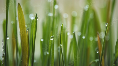Fototapeta premium Young sprouts of grass with dew. Close-up view.