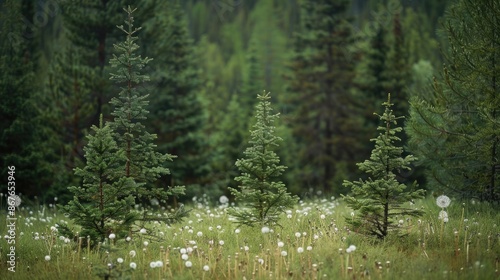 Fototapeta premium Young spruce trees thrive in a dandelion filled field amidst the forest backdrop