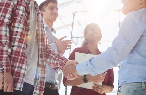 Obraz premium Young startup in casual clothes shaking hands in a modern office space by the...