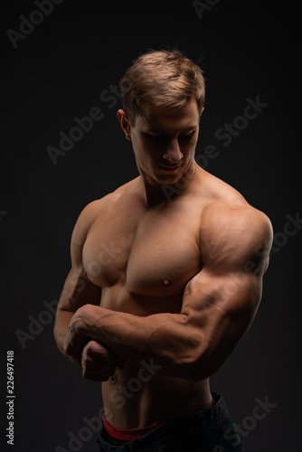 Fototapeta premium young, Strong bodybuilder with six packs. Bodybuilder flexes muscles against dark background