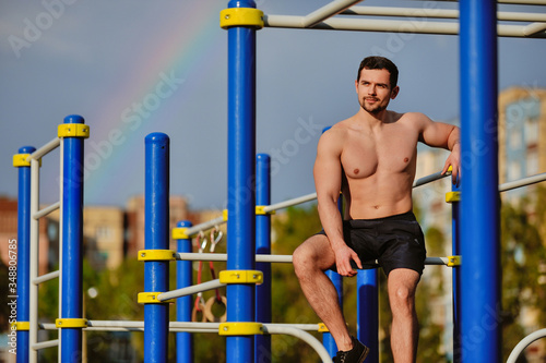Fototapeta premium Young strong guy pulls himself up on the horizontal bar.