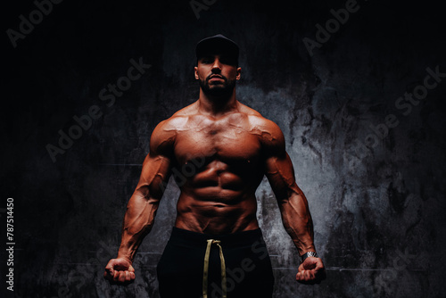 © chaossart, Fototapeta premium Young strong man bodybuilder in cap on stone wall background
