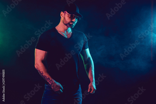 © zamuruev, Naklejka premium Young strong man bodybuilder in cap on wall background. Dark dramatic colors. Smoke on background.
