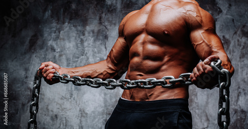 © chaossart, Naklejka premium Young strong man bodybuilder with heavy chain on dark wall background
