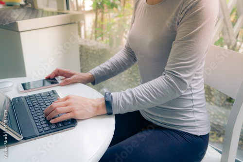 © PORNCHAI SODA, Naklejka premium Young student women wearing smart band using tablet computer