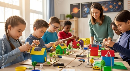 Fototapeta premium Young students and teacher busy working together on a school project.