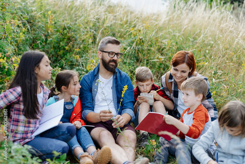 Fototapeta premium Young students learning about nature, forest ecosystem during biology field teaching class, observing wild plants. Dedicated teachers during outdoor active education.