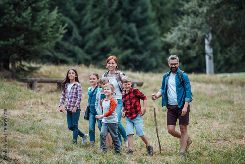 Fototapeta premium Young students learning about nature, forest ecosystem during biology field...
