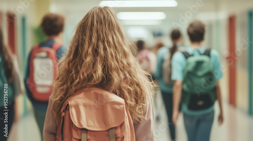 Fototapeta premium Young students walking down a school hallway with backpacks, view from behind