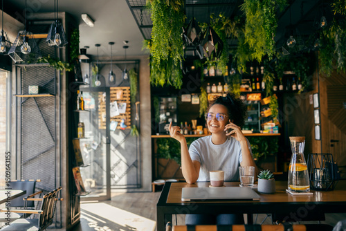 © Dusan Petkovic, Naklejka premium Young stylish interracial girl talking on cellphone in coffee shop.
