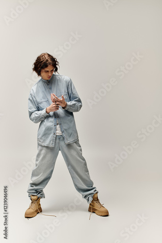 Fototapeta premium Young stylish man stands confidently in relaxed denim attire, exuding urban...