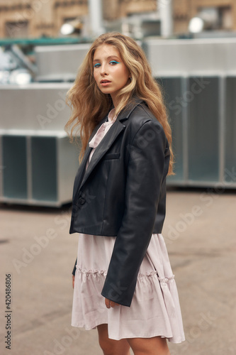 © Dmitry Tsvetkov, Fototapeta premium Young stylish woman in pink dress, black leather jacket and boots walking at urban location. Female model with long wavy blonde hair outdoor fashion look.