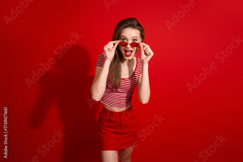 © deagreez, Obraz premium Young stylish woman in red outfit with sunglasses posing on a red background expressing surprise and joy