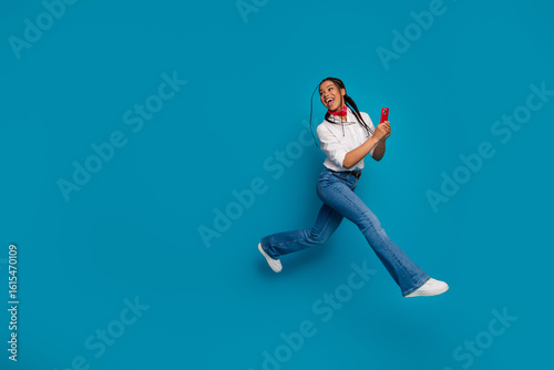 © deagreez, Fototapeta premium Young stylish woman jumping joyfully while holding a smartphone, showcasing vibrant personality and casual fashion