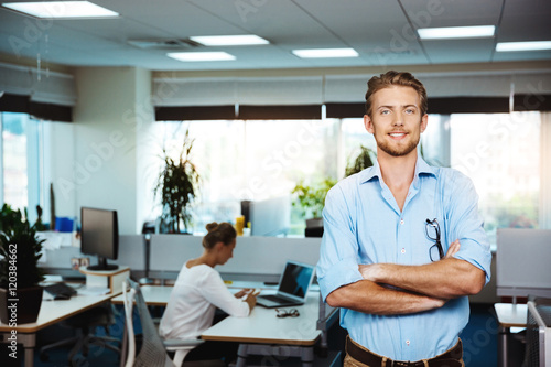 Fototapeta premium Young successful businessman smiling, posing with crossed arms, over office...