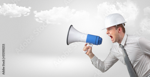 Fototapeta premium Young supervisor architect yelling to far big city panorama